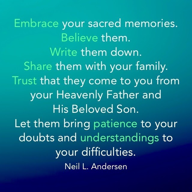 "Embrace your sacred memories. Believe them. Write them down. Share them with your family. Trust that they come to you from your Heavenly Father and His Beloved Son. Let them bring patience to your doubts and understanding to your difficulties. I promise you that as you willingly acknowledge and carefully treasure the spiritually defining events in your life, more and more will come to you. Heavenly Father knows you and loves you!"