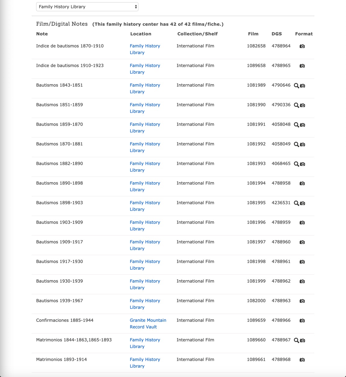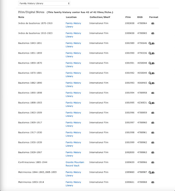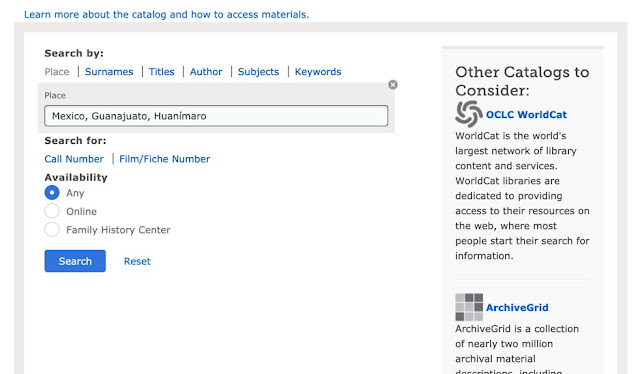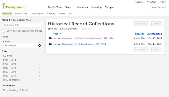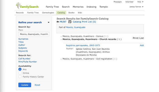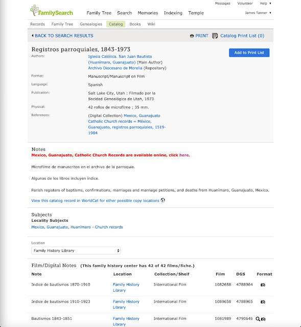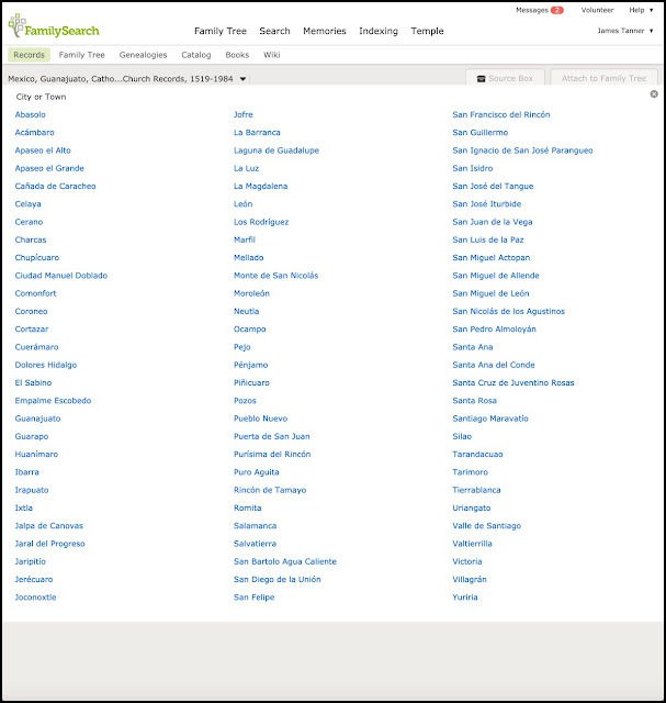 The image above is the FamilySearch.org Catalog page for Guanajuato, Mexico Catholic Church Records. Here is how I got to this list.