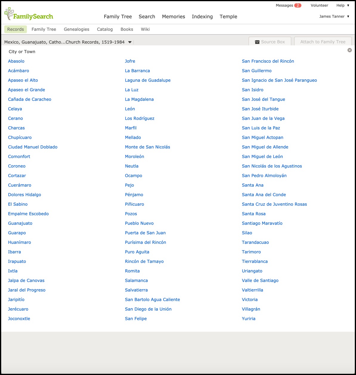 I can see a large collection of records or I can also search individual types of records for different years. If I choose to search all the records using the red notice, I will be trying to match a name and a place for the entire state of Guanajuato. But here’s the catch. If I go to the Historical Record Collection and look at the entry for Mexico, Guanajuato, Catholic Church Records, 1519-1984, I will see that there are 1,481,850 records and that number was last updated in 2017. This is the number of indexed images because the number of records listed in the Historical Record Collections list are only those records that are indexed.