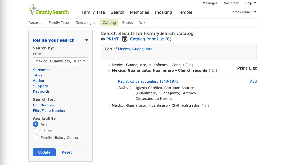 Before you start searching in the Catalog, you should understand that the entire Catalog is organized primarily by the place events that occurred in your ancestors’ lives. So, I need to know that these particular ancestors (not mine but those of a friend) were from Guanajuato and more specifically, I need to know exactly the location of an event in the life of at least one of these people down to the parish or town. If I know a verifiable location, I can begin to look for pertinent records. In this case, my friend has a marriage certificate showing that his grandparents were married in Huanimaro, Guanajuato, Mexico.