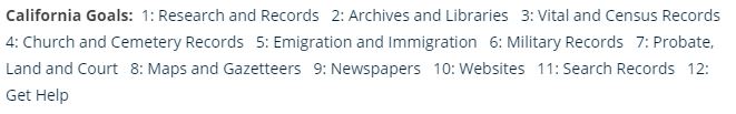 Each Country page typically has similar research Goals, each with helpful steps to follow, and links to articles and videos. As an example, here are the Goals from the California page: