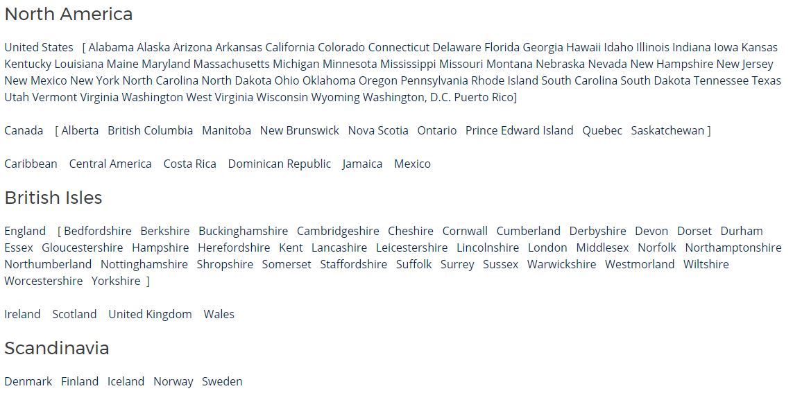 From there, you can click a country name to see its research page, or click a U.S. state, Canadian province, or England county. To help you navigate, region links are listed just below the picture near the top of the page: