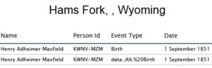 Using Kinmapper, I was able to get a satellite view of Ham’s Fork, Wyoming – a sacred place to our family. For the first time in my life, I saw how far from civilization it is (even to this day), and the stories of my great, great, great-grandparents, John Ellison and Sarah Elizabeth Baker Maxfield traveling from Prince Edward Island, Canada, to the Territory of Utah became more real.