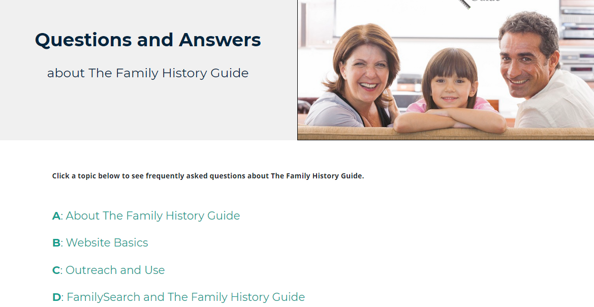 In advance of RootsTech 2021, we’ve decided to expand our FAQs. In fact, we created a whole new Questions and Answers page for them, arranged by categories that you can open and close. You can get to the new page by selecting “FAQ” in the Intro menu of The Family History Guide.