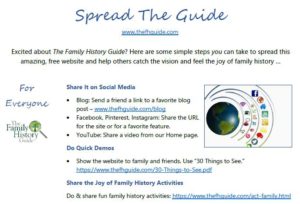 We have created a new one-page flyer called “Spread The Guide“. It’s on the Media page of the website, and it’s specifically designed to help you share The Family History Guide in a number of ways. Here are the basic areas that Spread The Guide focuses on: