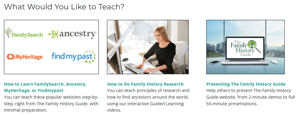 - Home page: The home page for the Trainers menu now focuses on helping trainers teach three important foundational elements of The Family History Guide: the Partner Sites (FamilySearch, Ancestry, MyHeritage, and Findmypast), doing research, and presenting The Family History Guide. These three items are also included as separate links in the Trainers menu (under “Home”) for easy access.