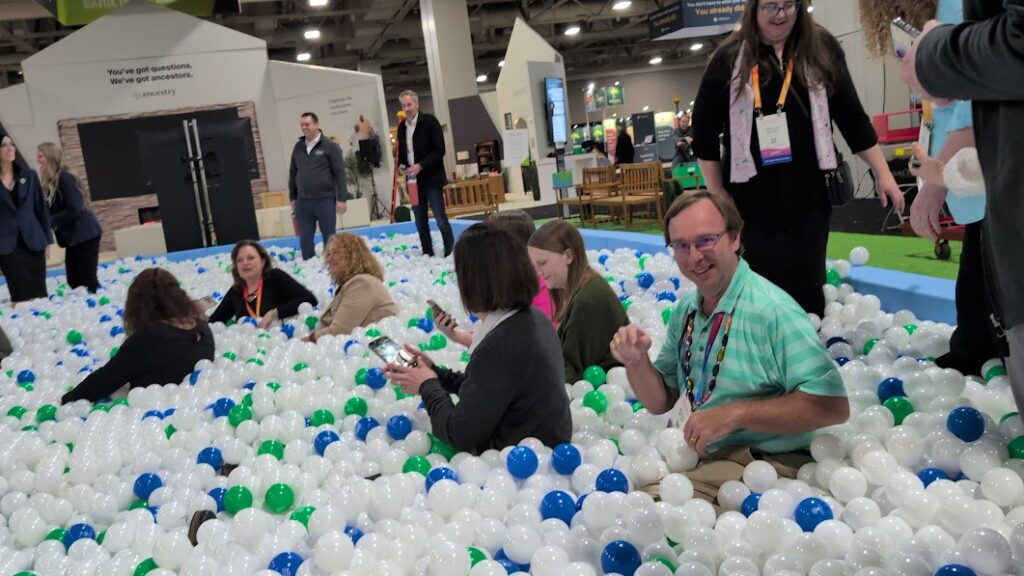 Miles Meyer, Education Director for The Family History Guide Assn., enjoys the ball pit at RootsTech