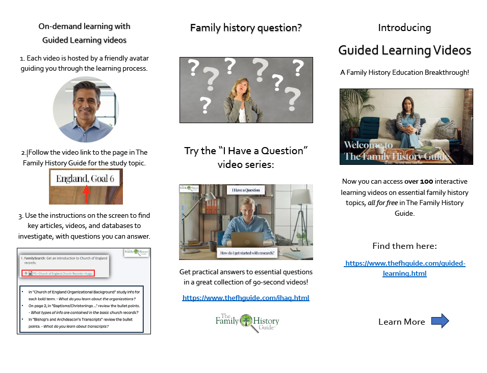 Welcome! Select any video link on this page to get a start your Guided Learning journey in The Family History Guide. Each video is hosted by one of our AI friends who will take you step-by-step through The Family History Guide experience. Once the video begins, you can click the broken-box icon to watch in full-screen mode. Enjoy!
