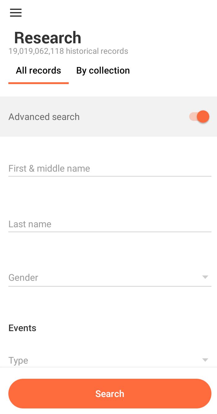 The Research screen helps you search all available MyHeritage records.